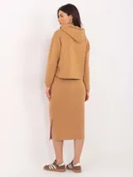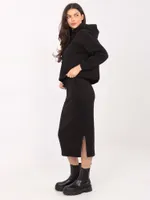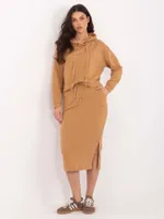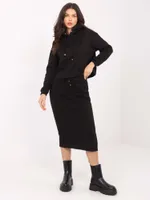 Wymiary kompletu w rozmiarze S mierzone na płasko: szerokość pod pachami - 59 cm, długość bluzy - 53 cm, długość rękawa - 50 cm, szerokość na dole - 55 cm, szerokość w pasie - 32 cm, szerokość w biodrach - 46 cm, długość spódnicy - 78 cm.