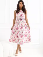 Rozkloszowana sukienka midi w groszki z paskiem